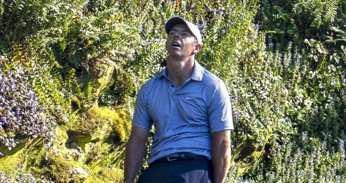 Rory McIlroy expresses frustration behind the 12th green -…