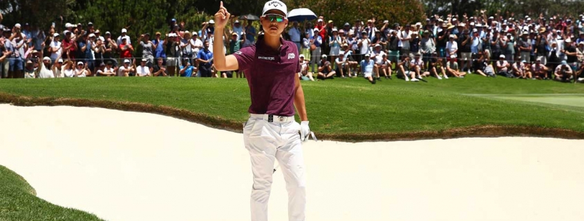 Min Woo Lee after holing a bunker shot during today’s second round – image Australian Golf Media