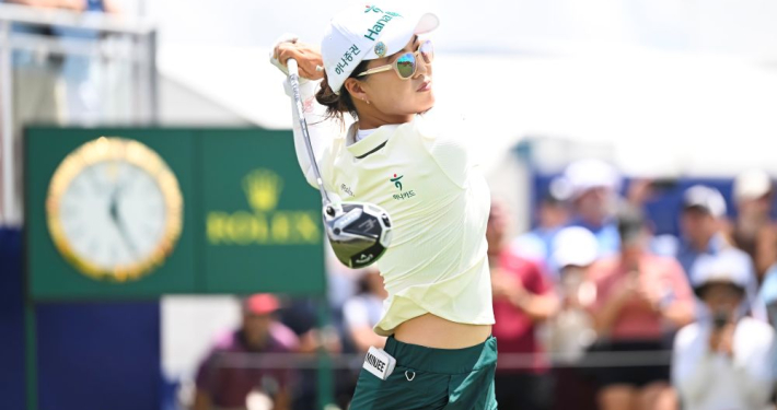 Minjee Lee hits her tee shot at the opening hole today – image…