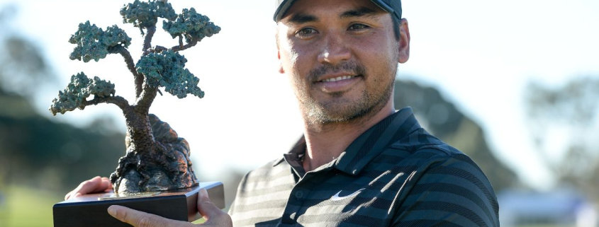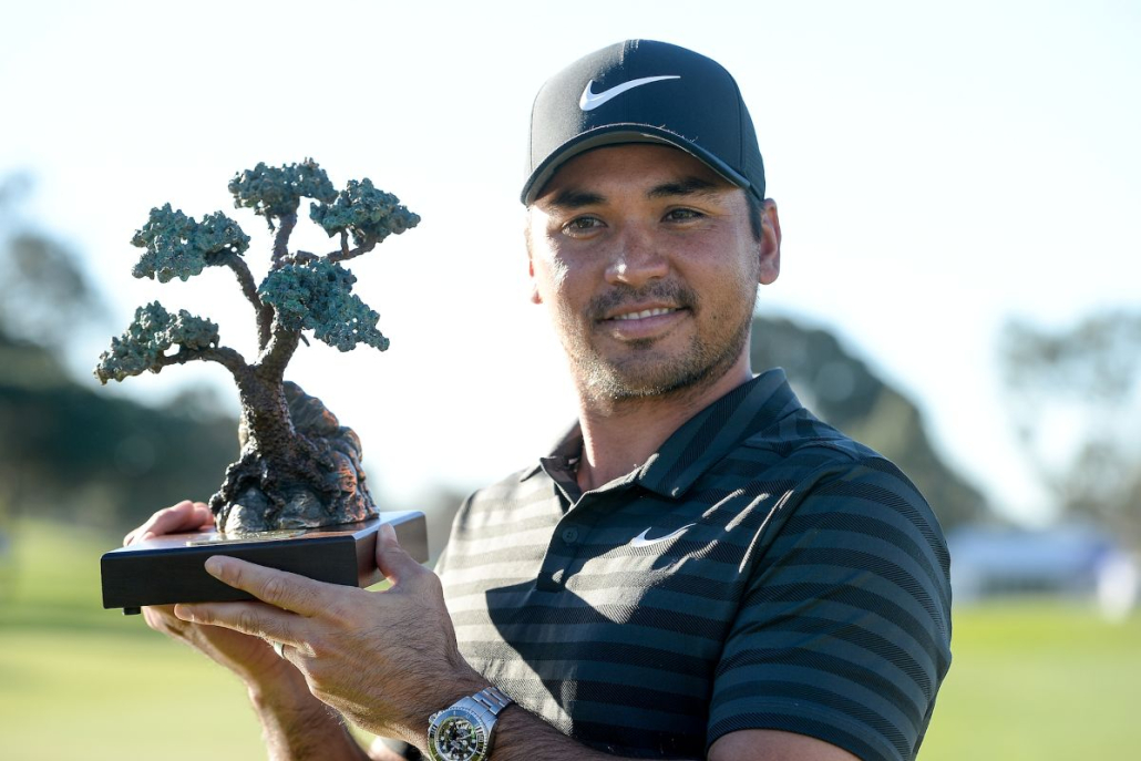Jason Day with one of his two Torrey Pines trophies – image Getty / PGA Tour