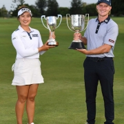 Su Oh and Jed Morgan hold their respective trophies – photo PGA of Australia.