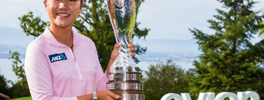 Lydia Ko holds the Evian Championship trophy she won in 2015